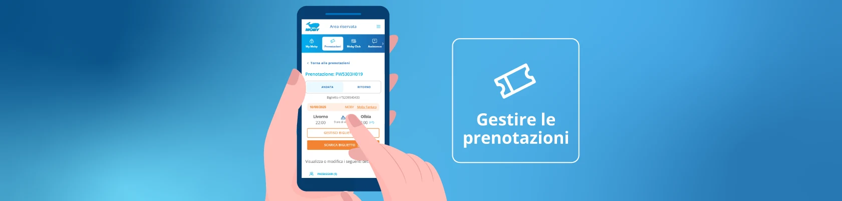 Se hai acquistato un biglietto online con Moby, Tirrenia o Toremar e vuoi modificare o annullare la tua prenotazione puoi farlo direttamente dalla tua Area Personale.